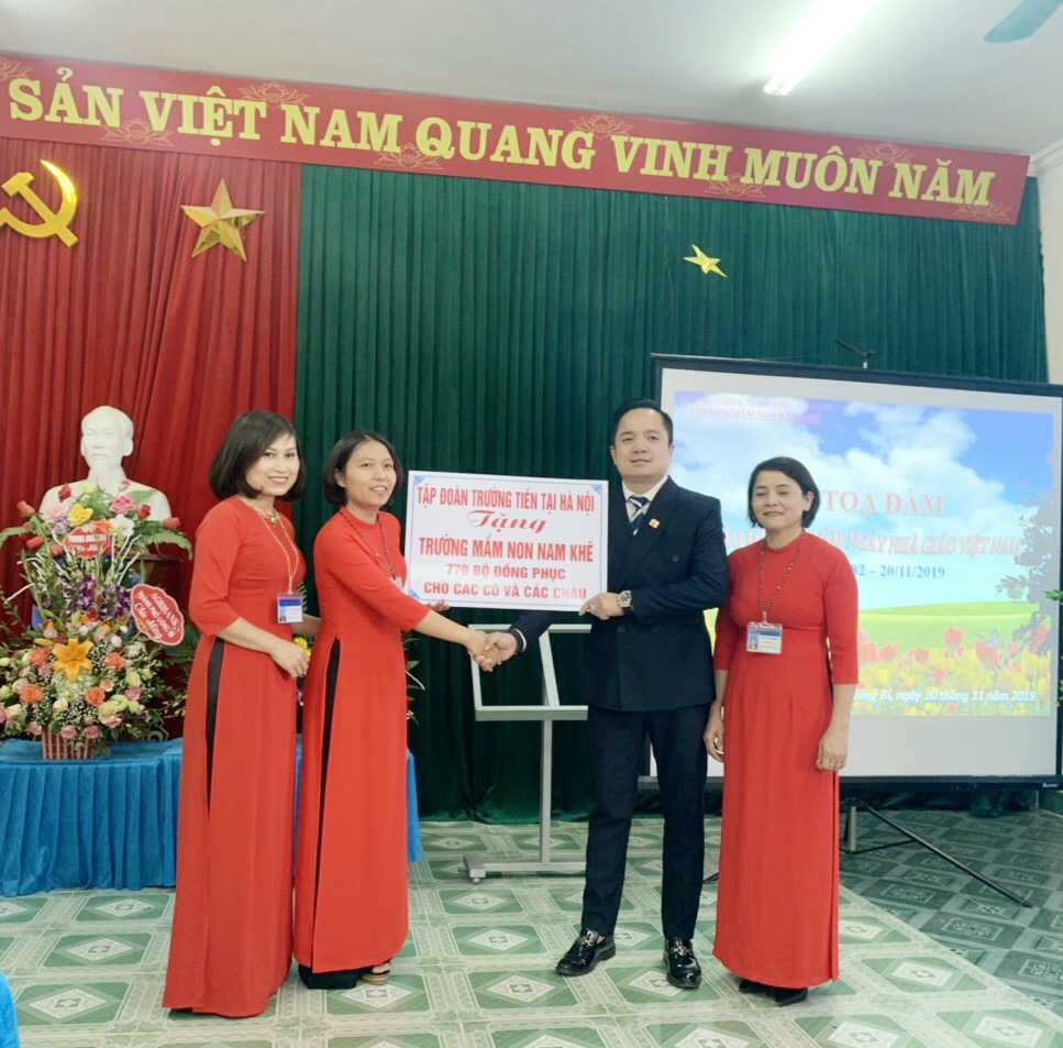 Ngày 20/11/2019, trường mầm non Nam Khê rất vinh dự được đón nhận rất nhiều tình cảm từ các đ/c lãnh đạo phường cùng các đơn vị đóng trên địa bàn phường: Công an, bộ đội, y tế...Đặc biệt cũng trong ngày 20/11, nhà trường được đón nhận hơn 700 bộ đồng phục từ tập đoàn Trường Tiền.