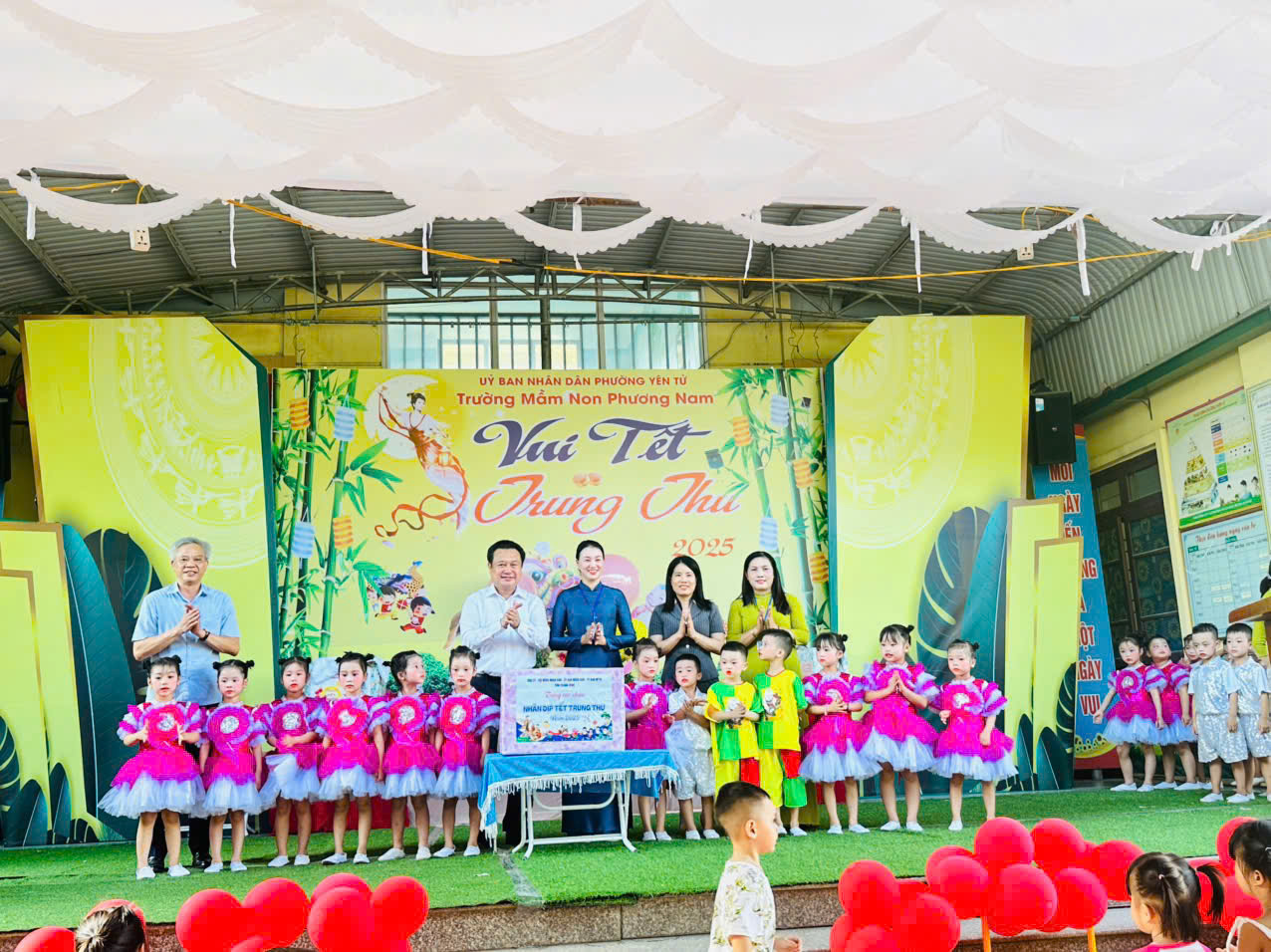 🌕✨ Vui hội Trăng Rằm – Tết Trung thu 2025 ✨🌕 🌷Hòa chung không khí rộn ràng của ngày Tết Trung thu – Tết của thiếu nhi, trường Mầm non Phương Nam hân hoan tổ chức Chương trình “Vui Tết Trung Thu” cho các bé. 🎶🥮🐲 🌷Thật vinh dự khi chương trình có sự hiện diện của các đồng chí lãnh đạo tỉnh, lãnh đạo phường cùng các bậc phụ huynh, quý khách đại biểu đã đến chung vui và động viên cô trò nhà trường: * Đoàn đại biểu đại diện Lãnh đạo tỉnh Quảng Ninh, - Bác Nguyễn Đức Thành - UVBTV Tỉnh ủy, Phó chủ tịch thường trực HĐND tỉnh Quảng Ninh; - Bác Lê Minh Sơn- Phó GĐ sở y tế - Trần Thị Thúy Quỳnh- Phó chánh Văn phòng Đoàn ĐBQH và HĐND tỉnh cùng các bác, các cô, chú trong đoàn công tác của tỉnh Quảng Ninh. * Đoàn đại biểu đại diện Lãnh đạo phường Yên Tử. - Chú Bùi Hoàng Giang -Tỉnh ủy viên, Bí Thư Đảng ủy phường - Chú Bùi Đức Anh- Ủy viên BCH Đảng bộ phường, phó chủ tịch UBND phường Yên Tử cùng các cô, các chú trong đoàn công tác của phường Yên Tử. - Bà Phạm Thị Thu Trang - Trưởng ban ĐDCMHS nhà trường. Đây là nguồn khích lệ to lớn để tập thể cán bộ, giáo viên và các con nhỏ thêm phần hứng khởi, tự tin. 🌸 🌷Các bé đã được hòa mình trong không khí náo nức của lễ hội với nhiều tiết mục văn nghệ đặc sắc, những điệu nhảy sôi động cùng màn ảo thuật hấp dẫn. 💃🎶✨ Chương trình còn cô cùng đặc biệt náo nhiệt với màn múa lân cực kỳ đẹp mắt😍 🌷Đặc biệt, phần phá cỗ trăng rằm ngập tràn sắc màu và hương vị ngọt ngào đã mang đến cho các bé những kỷ niệm thật đáng nhớ. 🌟 Chương trình không chỉ đem lại niềm vui cho các em nhỏ mà còn góp phần gìn giữ, lan tỏa nét đẹp văn hóa truyền thống của dân tộc. Nhà trường xin trân trọng cảm ơn sự quan tâm, đồng hành của các cấp lãnh đạo, chính quyền địa phương và quý phụ huynh. Kính chúc các bé luôn chăm ngoan, khỏe mạnh, học giỏi và có một mùa trăng tròn thật ý nghĩa, tràn ngập tiếng cười và yêu thương. 💖🌕🐲