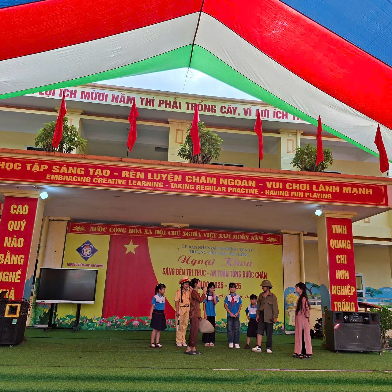 Ngày 11/10/2025, sân trường Tiểu học Kim Đồng rộn ràng không khí náo nhiệt, sôi nổi với hoạt động ngoại khóa ý nghĩa: “Sáng đèn tri thức – An toàn từng bước chân”. Đây không chỉ là sân chơi trí tuệ mà còn là dịp để các em học sinh nâng cao kiến thức, kỹ năng sống, đặc biệt là ý thức về an toàn giao thông và văn hóa ứng xử học đường.