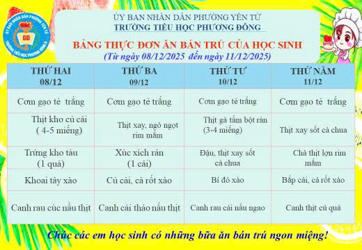 Thực đơn bán trú (Từ ngày 08/12 đến ngày 11/12/2025)