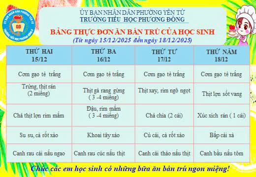 Thực đơn bán trú (Từ ngày 15/12 đến ngày 18/12/2025)