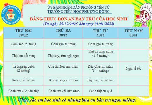 Thực đơn bán trú (từ ngày 29/12 đến ngày 01/01/2026)